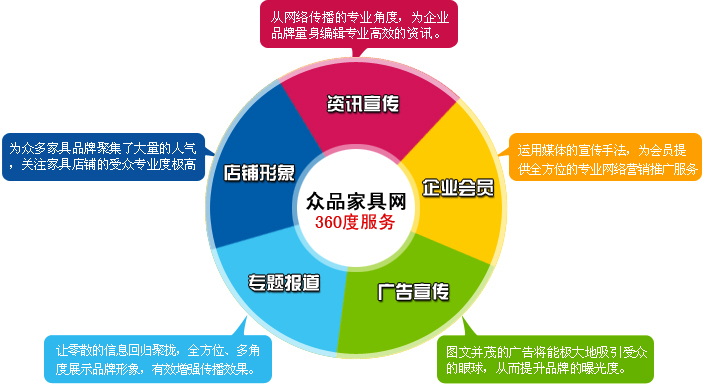 眾品家具網的企業會員分為三個等級——普通會員、高級會員、鉆石會員。眾品家具網運用媒體的宣傳手法,分別從企業、品牌、招商、店鋪、產品等角度,為會員提供360°全方位的專業網絡營銷推廣服務。